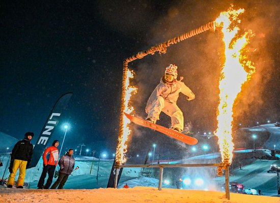 在坐落于阿勒泰市城区的新疆将军山国际滑雪度假区,雪友在新春趣味滑雪公园跳台活动中钻过火圈(2025年1月29日摄)。新华社记者 陈朔 摄