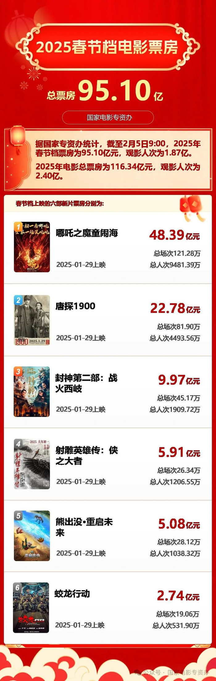 国家电影专资办2月5日9时票房数据。国家电影专资办官方微信号
