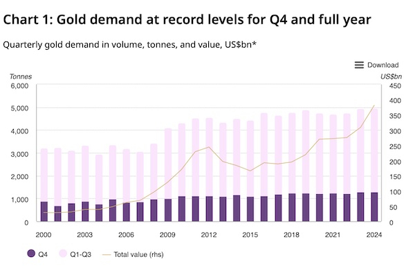 5日,世界黄金协会发布2024年四季度及全年《全球黄金需求趋势报告》,显示受持续强劲的央行购金和投资需求增长的双重驱动,包含金饰制造、科技制造、投资、央行净买入以及场外交易(OTC)的全球黄金年度需求总量达4974吨,创历史新高。
