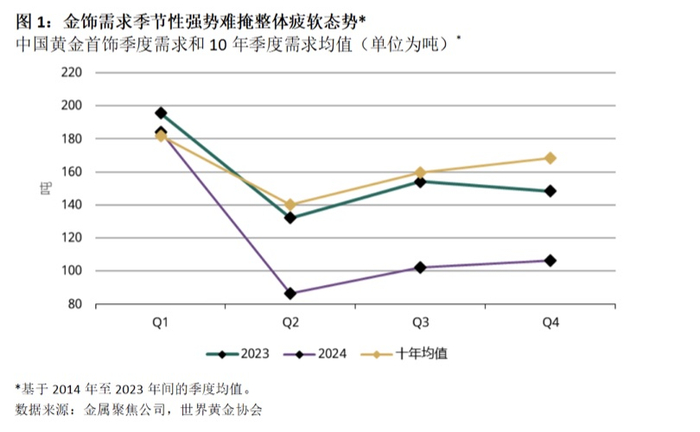其中,2024年中国市场金饰需求总量为479吨,同比下降24%;印度市场需求则微降2%。