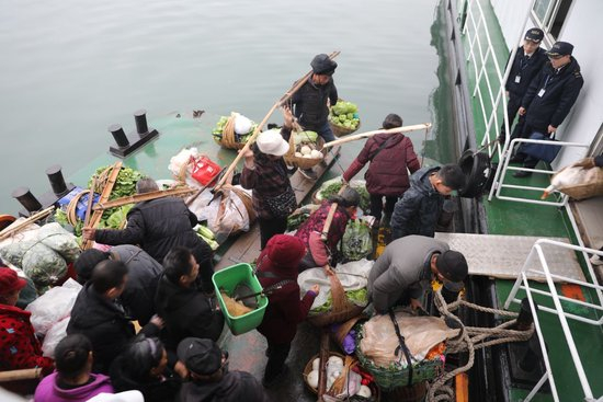 下午2时,菜农们背着空背篓陆续登船,等待返程。彭泽祥当天卖出了300多块钱,“再卖一天,几个娃儿的红包就能更鼓一些啦”;陈立举带来的几十斤蔬菜一售而空,“明天就不来了,开始忙年喽”;冉龙权卖完菜,背篓里装上了刚购买的对联、糖果……见到记者,菜农们纷纷讲述着一天的收获。