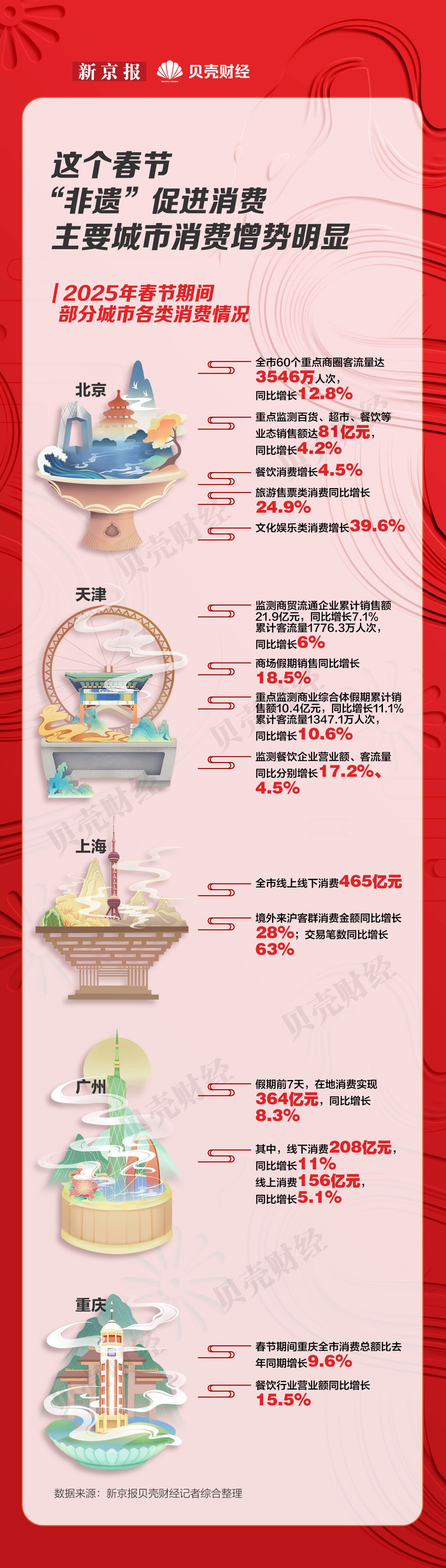 数据显示,各大城市在春节期间消费增势明显。截至2月4日,北京市60个重点商圈客流量达3546万人次,同比增长12.8%,百货、超市、专业专卖店等业态实现销售额81亿元,同比增长4.2%;天津市监测商贸流通企业累计销售额21.9亿元,同比增长7.1%;上海全市线上线下消费465亿元,境外来沪客群消费金额同比增长28%;广州春节假期前7天在地消费实现364亿元,同比增长8.3%;重庆全市消费总额比去年同期增长9.6%,餐饮行业营业额同比增长15.5%。