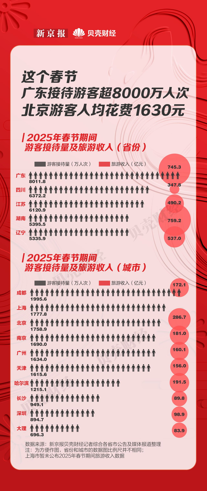 据新京报贝壳财经记者不完全统计,春节假期期间,成都、上海、北京、南京、广州、天津、哈尔滨等城市的游客接待量均超过1000万人次,其中,成都游客接待量接近2000万人次,达到1995.6万人次。广州、天津、哈尔滨、成都、深圳、大理等地旅游收入均实现大幅增长。