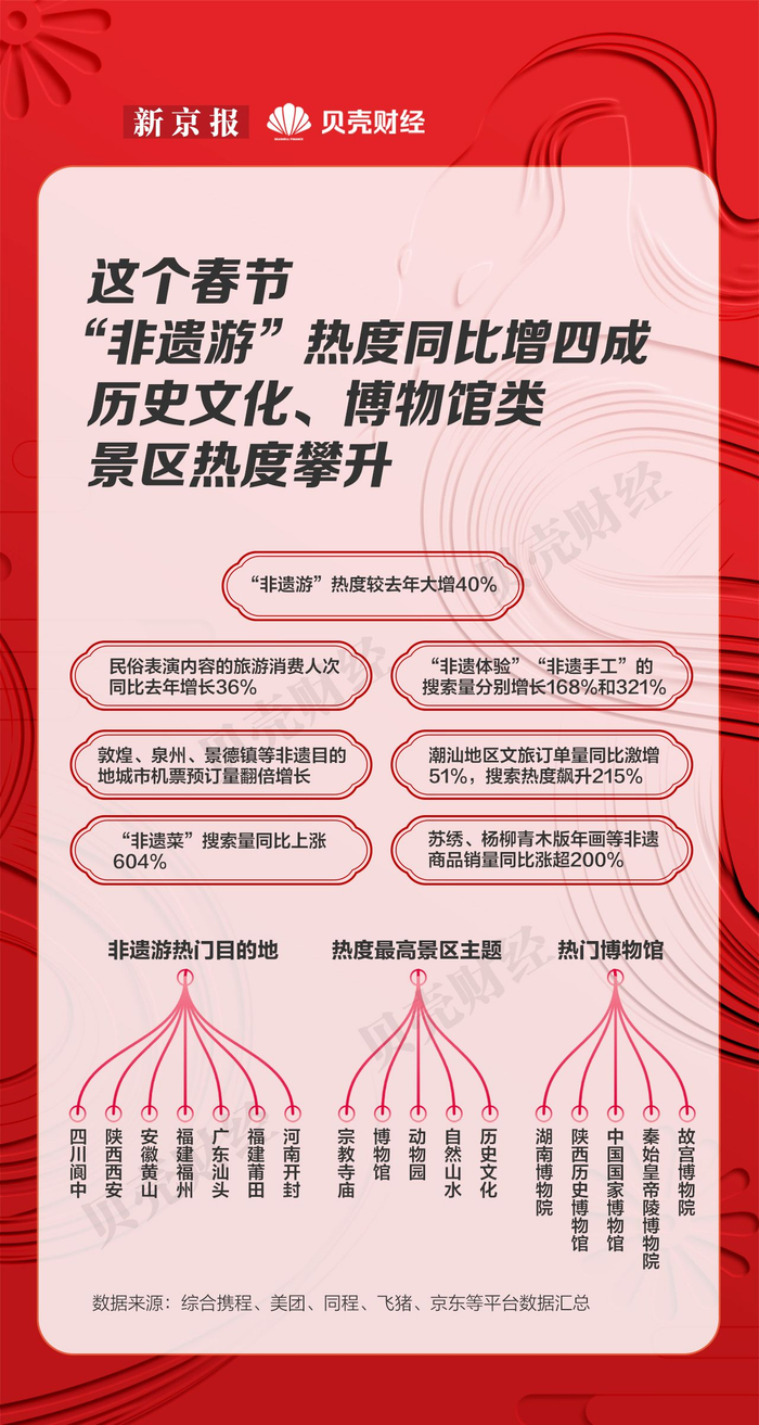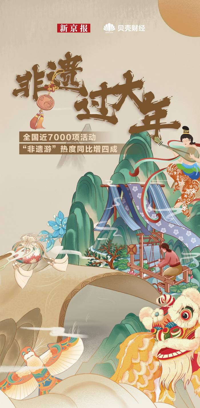“非遗体验”“非遗手工”“非遗美食”……成为今年春节文旅消费亮点,带动假日旅游市场热度强劲攀升,多地文旅市场“开门红”。新京报贝壳财经记者透过春节文旅消费数据解密“非遗经济”如何成为春节消费新密码。
