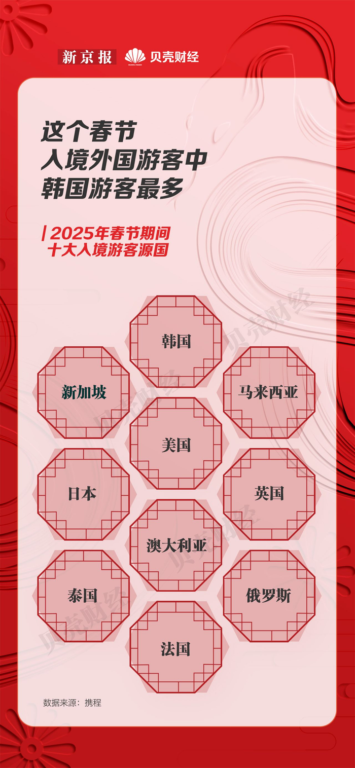 2025年春节期间,十大入境游客源国依次为韩国、美国、马来西亚、新加坡、日本、英国、泰国、俄罗斯、澳大利亚、法国,其中日韩、新马泰等短线入境游订单同比去年春节增长130%,法国、西班牙等长线入境游同比去年增长近120%。一线城市仍为最主要的入境游目的地,前十大热门入境游目的地城市中,春节假期热门旅行城市北京、哈尔滨均上榜。