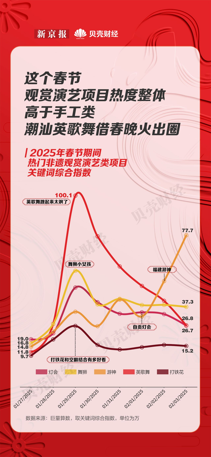 社交媒体关键词综合指数显示,春节期间,观赏演艺类的非遗年俗项目因其与节庆高度相关,且极富观赏性和地方特色,在短视频平台的热度整体高于手工类。根据新京报贝壳财经记者的整理,潮汕英歌舞、福建游神、舞狮、打铁花和灯会等观赏演艺类项目的综合热度较高,且均在大年初一(1月29日)达到峰值。