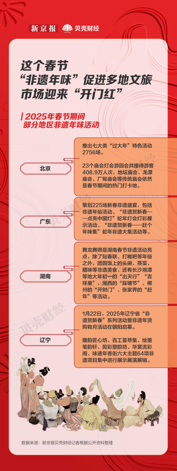 新京报贝壳财经记者梳理发现,除了丰富热闹的非遗文化活动,还有非遗美食和非遗“展演展销”。受此吸引,湖南、辽宁春节期间游客接待量同比实现较大增幅,分别增长46.37%、30.57%。