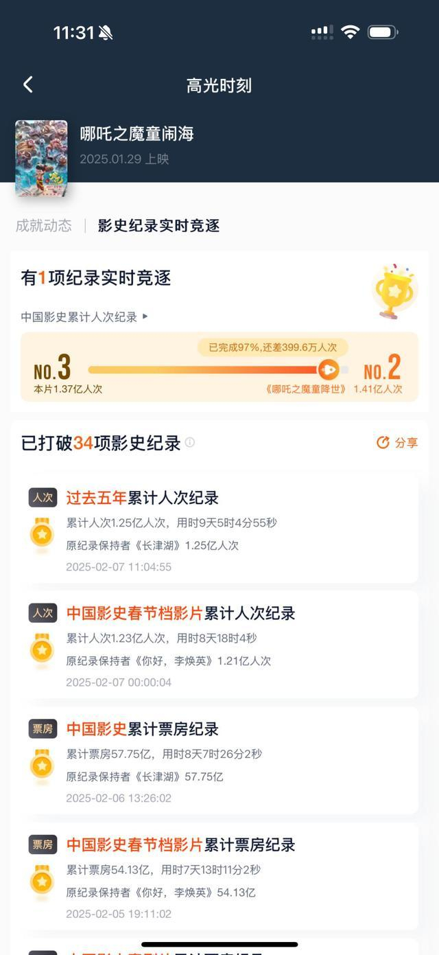 截至2月8日17时07分,电影《哪吒之魔童闹海》票房突破72亿,登顶全球单一市场票房榜。目前《哪吒2》电影已获包括国内影史累计票房纪录、中国影史春节档影片累计人次纪录等共34项成就。《哪吒2》用时不到9天即冲顶中国影史票房榜。
