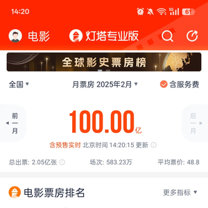 新京报讯 据灯塔专业版,截至2月11日14时20分,2025年2月总票房(含预售)突破100亿。《哪吒之魔童闹海》贡献当月超7成票房。