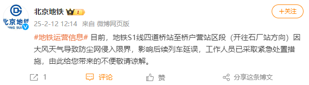 因大风天气导致防尘网侵入限界,北京地铁S1线部分列车延误