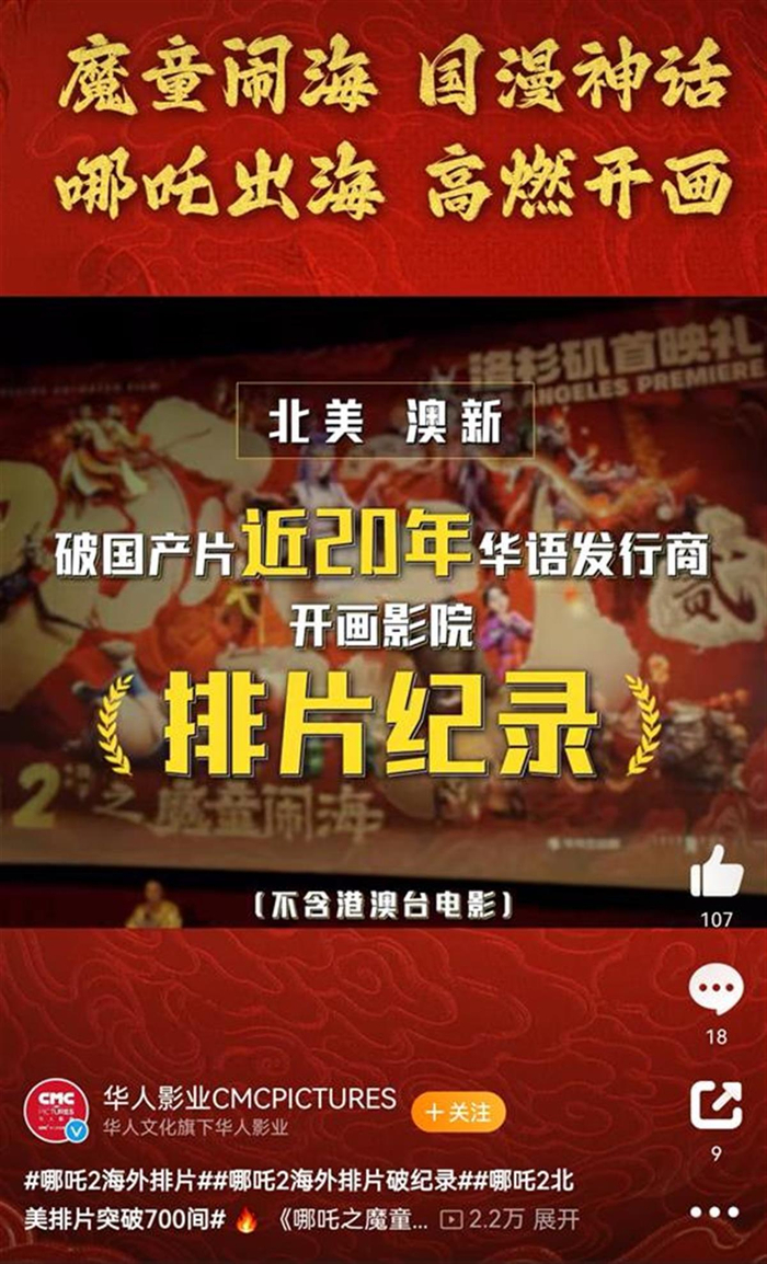 据华人影业官方消息:《哪吒2》13日在澳大利亚和新西兰正式上映,北美14日正式上映。