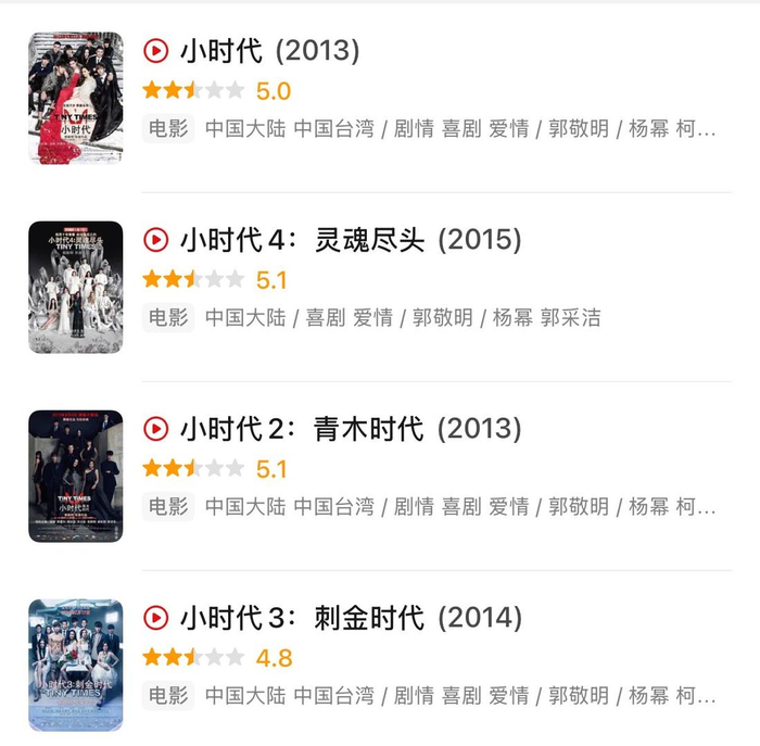 而与喜剧并驾齐驱的还有另一类题材,就是青春爱情片,《致我们终将逝去的青春》《同桌的你》《匆匆那年》《栀子花开》等影片都取得了不错的票房成绩。
