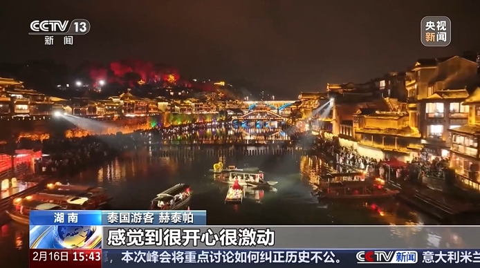 随着我国过境免签政策的不断调整优化,大批外国游客来到中国深度体验中国文化。这个蛇年春节,湖南湘西的凤凰古城也迎来了一波入境游热潮,来自泰国、越南、美国等近20个国家和地区的游客,沉浸式体验“神秘湘西”的独特魅力。
