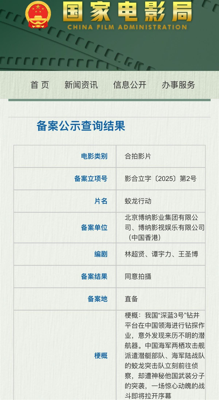 国家电影局官网信息显示,《蛟龙行动》此次备案立项号为〔2025〕第2号,电影类别从此前的“故事影片”调整为“合拍影片”,备案单位由原来的北京博纳影业集团有限公司,调整为北京博纳影业集团有限公司和博纳影视娱乐有限公司(中国香港)。