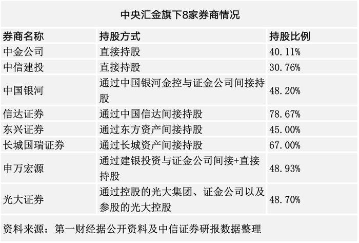 具体来看,这8家中,中央汇金直接持股的是中金公司、中信建投,持股比例分别为40.11%和30.76%;间接持股的是中国银河、东兴证券、信达证券和长城国瑞证券,持股比例分别为48.2%、45%、78.67%和67%。