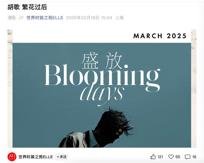 2月18日,时尚杂志《ELLE世界时装之苑》发布三月刊封面,第五次亮相封面的演员胡歌,其采访文章《繁花过后》也在社交平台引发关注。