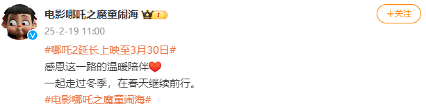 《哪吒2》延长放映时间至3月30日