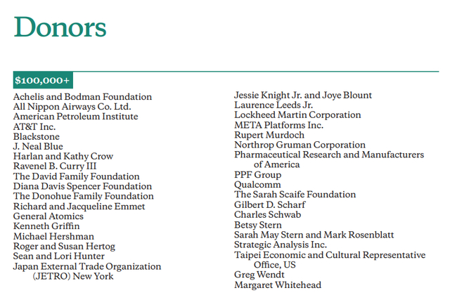 哈德逊研究所2023年度报告显示,台当局捐款额为“10万美元+”