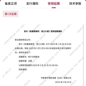 刚刚,《射雕英雄传侠之大者》官宣延期! 极目新闻 楚天都市报官方账号 2025.02.1918:16 关注 来源:红星新文娱据猫眼专业版,《射雕英雄传侠之大者》密钥延期,延长上映至3月31日,截至当前累计票房6.50亿。
