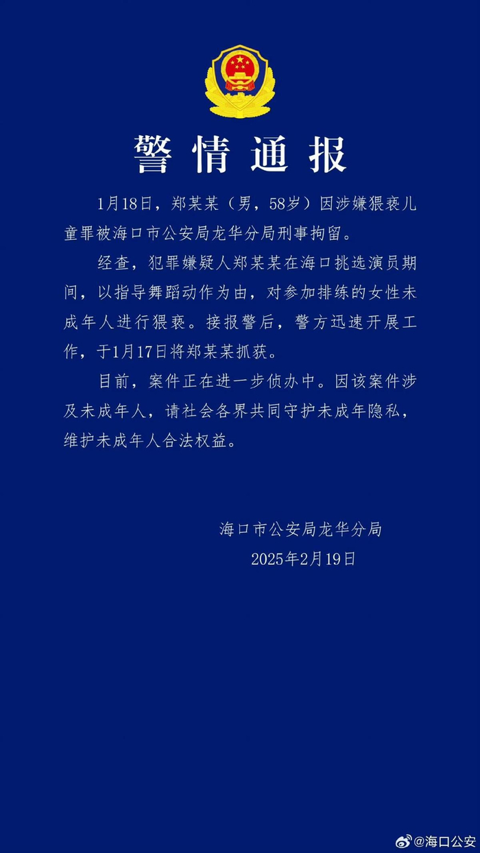 2月19日晚10时许,海口公安官方账号发布警情通报,通报显示:1月18日,郑某某(男,58岁)因涉嫌猥亵儿童罪被海口市公安局龙华分局刑事拘留。经查,犯罪嫌疑人郑某某在海口挑选演员期间,以指导舞蹈动作为由,对参加排练的女性未成年人进行猥亵。接报警后,警方迅速开展工作,于1月17日将郑某某抓获。目前,案件正在进一步侦办中。