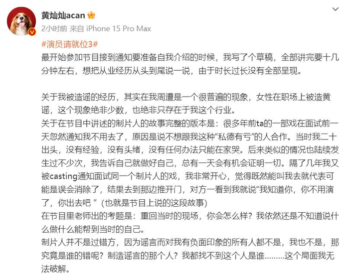 2月22日,黄灿灿在个人社交账号发长文回应:“最开始参加节目接到通知要准备自我介绍的时候,我写了个草稿,全部讲完要十几分钟左右,想把从业经历从头到尾说一说,由于时长过长没有全部呈现。
