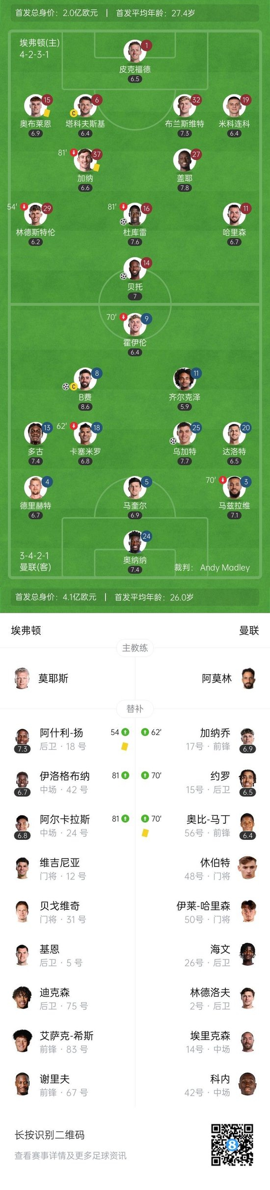 直播吧2月22日讯 北京时间2月22日20:30,2024-25赛季英超联赛第26轮,埃弗顿坐镇古迪逊公园球场迎战曼联。上半场贝托破门,杜库雷建功,曼联暂0-2埃弗顿;下半场B费任意球破门,乌加特凌空斩,补时阶段阿什利-扬倒地,主裁判先是判罚点球随后在观看VAR后取消,最终曼联2-2战平埃弗顿,近10轮英超仅收获2胜。