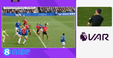 第83分钟,齐尔克泽头球攻门,这球击中了防守球员,曼联球员投诉有手球,VAR介入,判定不是手球。↓