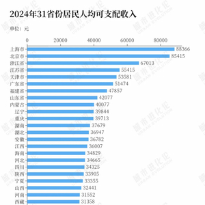 国家统计局公布的数据显示,全国31省份中,上海、北京、浙江、江苏、天津的居民人均可支配收入稳居全国前五强。其中,2024年上海居民人均可支配收入88366元,位列第一;同处“8万元”梯队的北京为85415元。