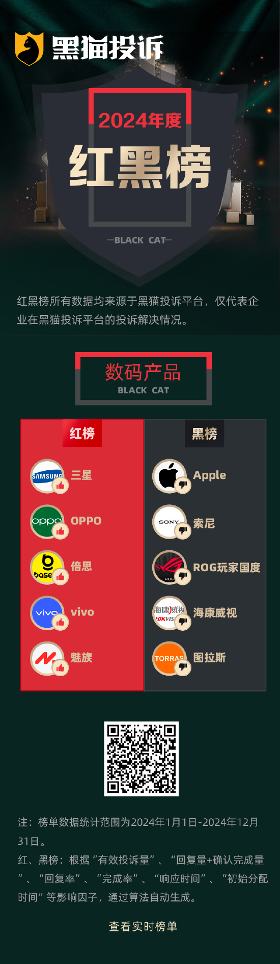 截至2024年底,黑猫投诉平台累计收到有效投诉超2304万件,超1759万件消费纠纷得到企业回复。年度企业红黑榜单根据2024年全年企业在黑猫平台的投诉处理数据,公正客观、开放透明地反映商家对待消费纠纷的服务态度及服务质量。一方面希望全行业以优质服务企业为标杆,为消费者提供更好的消费体验和更优质的售后服务;另一方面也是对不负责任企业的监督与曝光,为消费者提供选购参考。