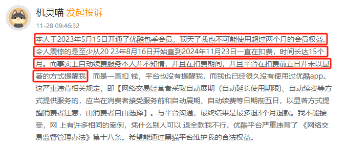 有消费者向黑猫投诉平台反映,其于2023年5月开通了优酷包季会员,但自2023年8月起至2024年11月,平台持续扣费长达15个月。消费者表示,对自动续费服务并不知情,且平台未在每次扣费前五日以显著方式提醒。截至2024年底,优酷累计投诉近1.9万件,回复率仅0.53%。