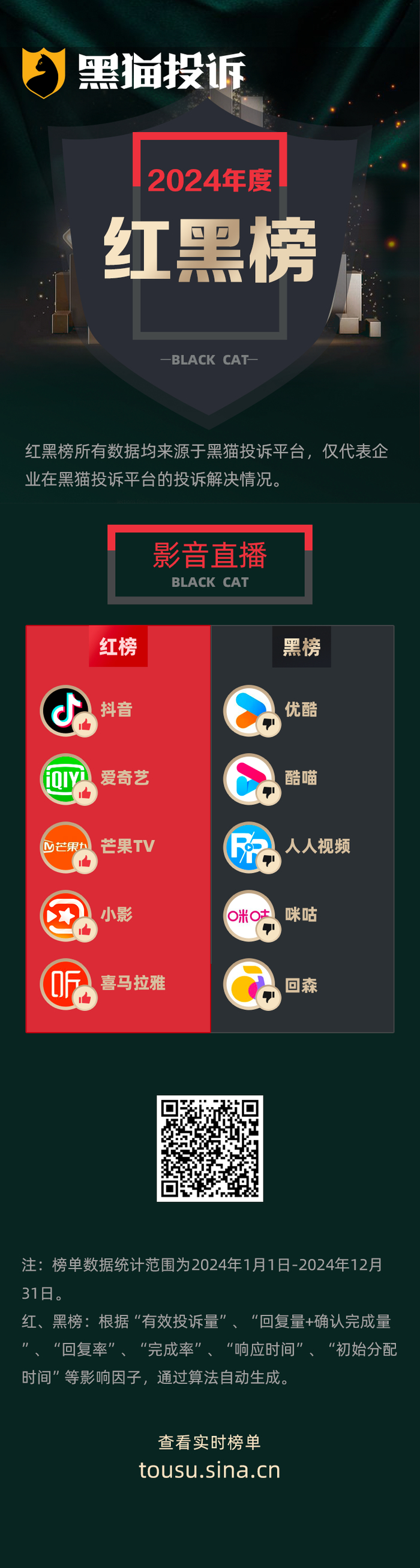 黑猫投诉发布2024年度影音直播领域红黑榜榜单:优酷无提醒自动续费长达15个月