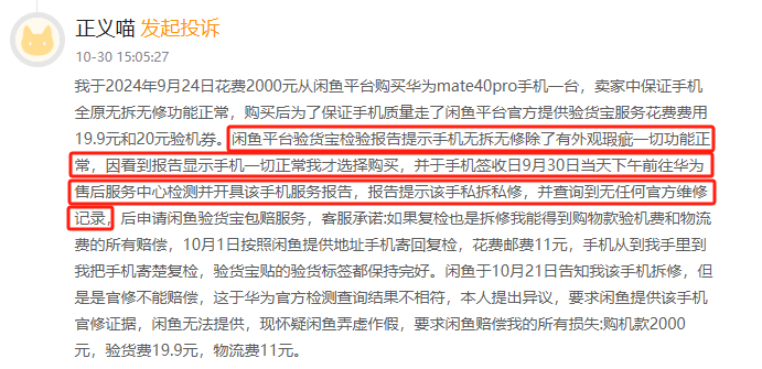 有消费者向黑猫投诉平台反映,其在闲鱼平台购买了一部手机,卖家承诺手机为“全原无拆无修,功能正常”。为确保手机质量,消费者使用了闲鱼官方提供的验货宝服务,验货报告显示手机无拆无修,仅存在外观瑕疵,功能一切正常。然而,消费者在收到手机当天前往华为售后服务中心检测,并获取了官方服务报告,结果显示手机存在私拆私修情况,且无任何官方维修记录。截至2024年底,闲鱼累计投诉近14万件,回复率为0。