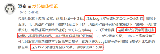 大量消费者投诉如鸢手游,称游戏活动出现bug,部分玩家可以利用bug重复刷去游戏内物品,甚至可以刷取氪金道具,对其他玩家非常不公平,要求商家作出补偿,相关投诉超过3000单。截至2024年底,灵犀互娱在黑猫投诉平台的回复率不到5%。