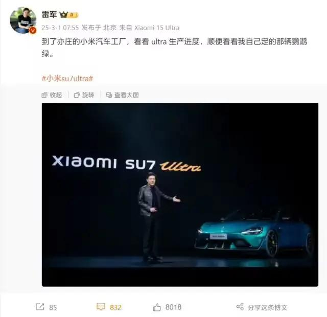 发布会现场,雷军透露自己选择了一台鹦鹉绿色的小米SU7 Ultra。3月1日早些时候,雷军发文称自己到达亦庄的小米汽车工厂查看SU7 Ultra的生产进度,“顺便看看我自己定的那辆鹦鹉绿”。