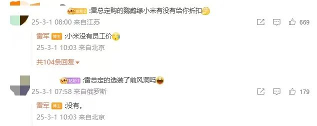 雷军在评论区里回复网友时透露自己的车辆没有选装前风洞。而在回复“小米有没有给你折扣”时,他表示:“小米没有员工价”。