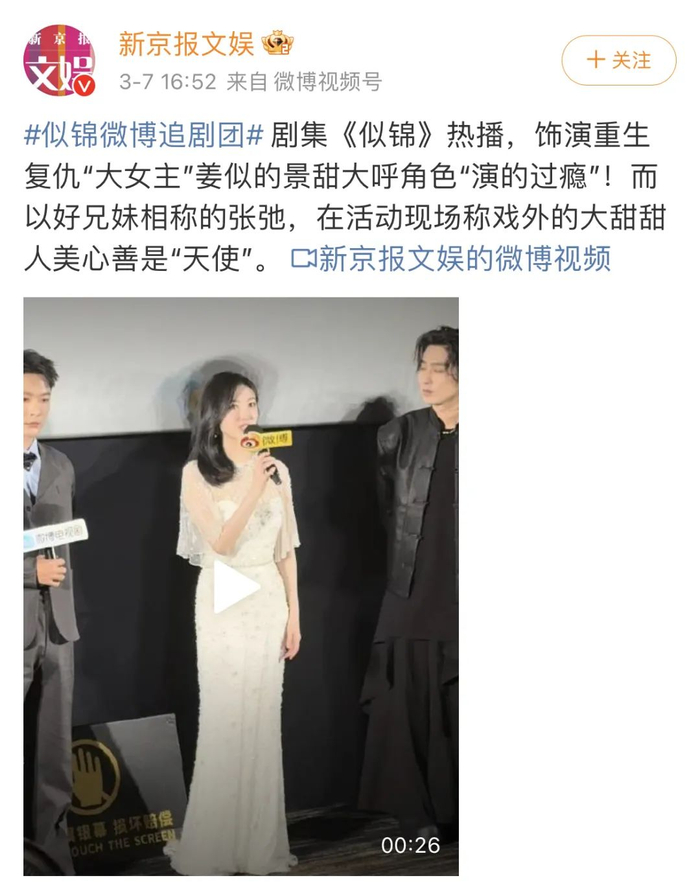 据了解,景甜想结婚的心愿出自景甜和张晚意为古装剧《似锦》剧宣的现场。