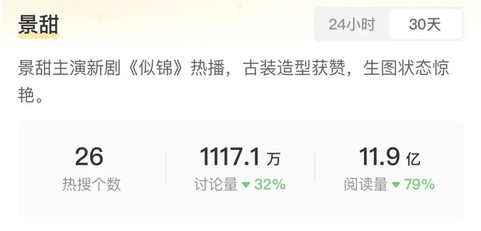 是的!“人间富贵花”景甜又杀回内娱啦!近30天内登上热搜26次,超11.9亿网友围观。