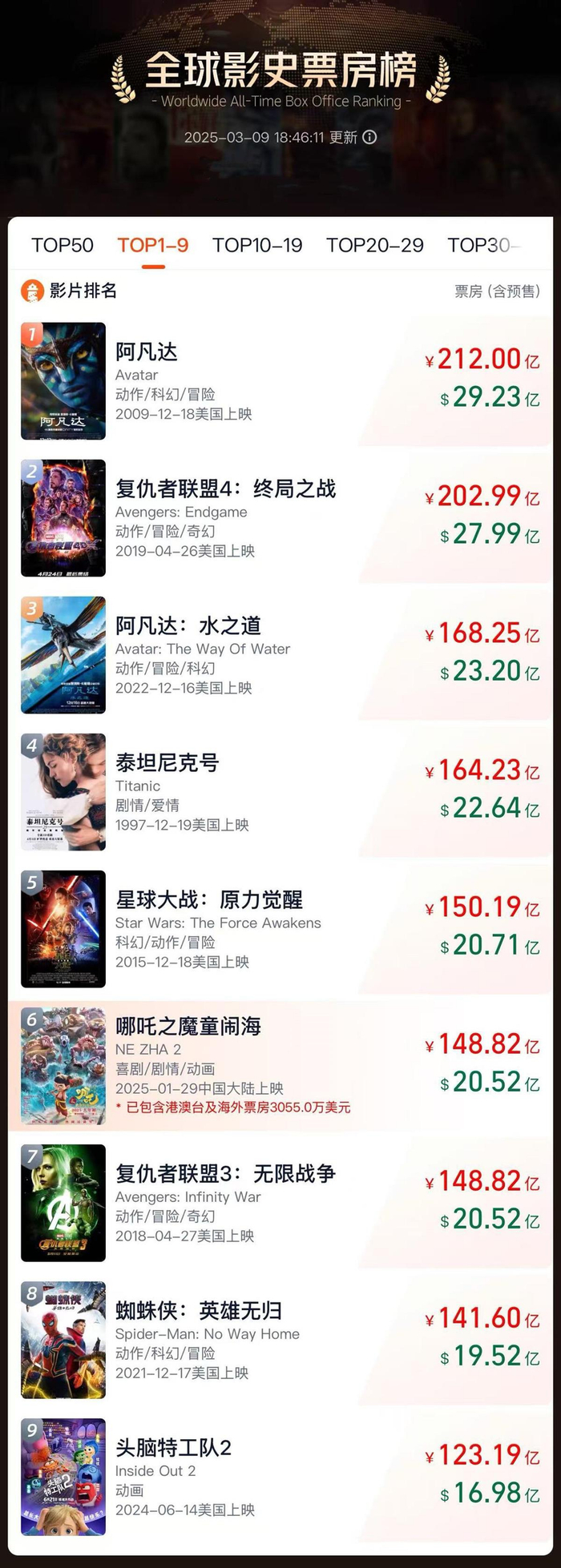 3月10日,电影《哪吒之魔童闹海》上映已超40天,综合票房超过148亿元,已超越《复仇者联盟3:无限战争》,全球票房排名第六。