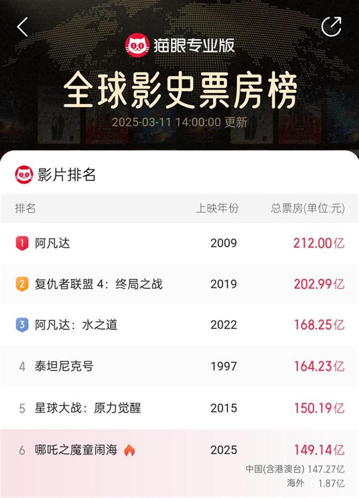 据猫眼专业版最新数据,截至3月11日14时整,《哪吒2》)的票房(含预售)达到149.14亿元,位列全球影史票房榜第六,距离上一名的《星球大战:原力觉醒》(《星战7》)只有1亿元的差距,离排名第四的《泰坦尼克号》的差距还有15亿余元,有网友预测,可能最终结果就是止步第五了。
