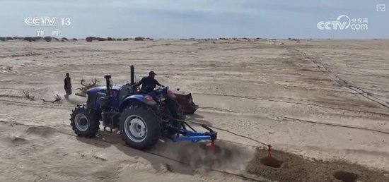 开好沟后,一台台螺旋钻机开始作业。随着土地平整、打井、铺设灌溉管道等基础工作完成,红枣、沙枣、红柳、梭梭等作物也开始栽种。