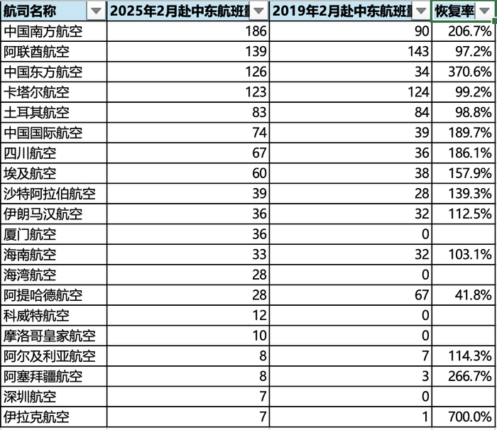 目前,国航和南航到中东的航班量是疫情前的2倍,东航到中东的航班量是疫情前的3倍,海航和四川航空到中东的航班恢复率也都接近200%。