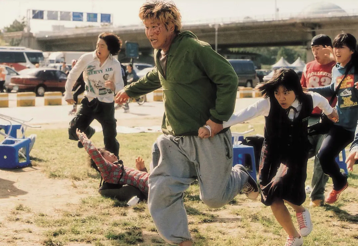 到《汉江怪物》,奉俊昊的枪口不再对准韩国历史及特殊时代,转而聚焦弱者的处境。当怪兽伤及弱者,本该寄予希望的人,非但不会帮助他们,反而会打压你。宋康昊饰演的父亲,只能和家人一起进行自救。