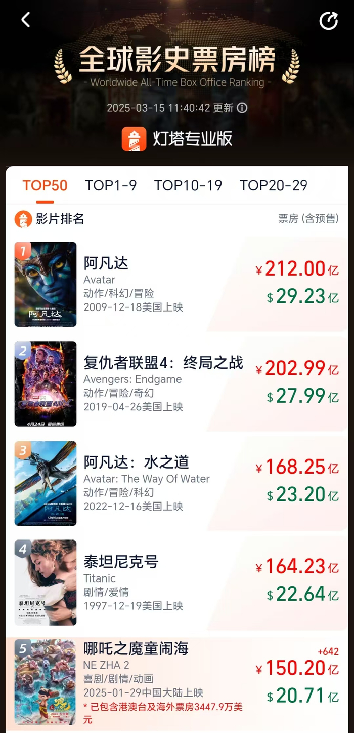 进入3月,已经上映一个多月的动画电影《哪吒之魔童闹海》(以下简称《哪吒2》)仍稳居单日票房榜首。据灯塔专业版数据,3月15日11时40分,《哪吒2》的总票房突破150.20亿,超过好莱坞大片《星球大战:原力觉醒》,位列全球影史票房榜第五位。