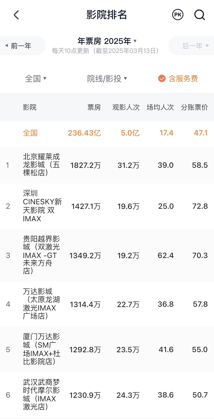 随着《哪吒2》的热映,观众对影厅的体验也有了更多元的选择和诉求,二刷、三刷《哪吒2》的观众会选择观影效果更好的特效厅。随即而来的,便是拥有特效厅的高端影院,票房收入也增长更快。3月12日,辽宁省科学技术馆(万达影城IMAX GT激光影厅)正式启动,当天综合票房便冲到了全国影院第二名,仅次于贵阳越界影城。