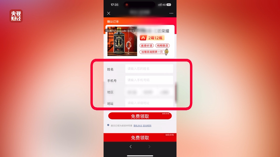 记者体验发现,大转盘抽奖后,页面会醒目提示“恭喜中奖”,跳转至白酒领取页面,消费者填写收货姓名、电话和地址,就能“领”千元白酒。