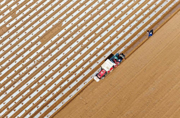 3月14日,在山东青岛西海岸新区六汪镇胶河马铃薯专业合作社春播现场,搭载北斗导航系统的马铃薯播种机在田间有序作业。新华社发(张进刚 摄)