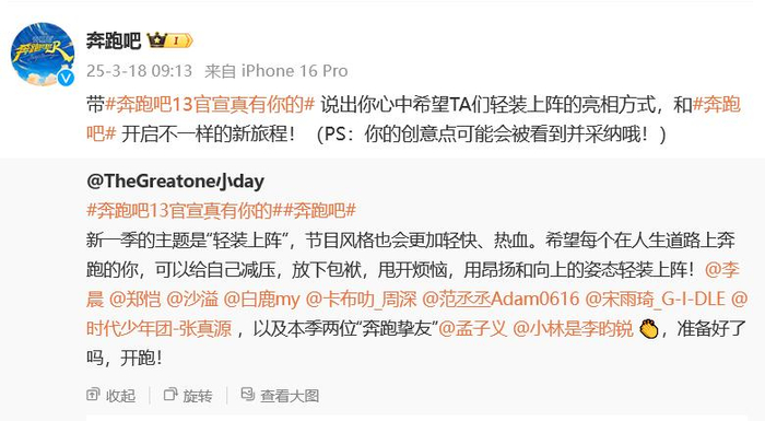 3月18日,《奔跑吧13》官宣阵容,登上微博热搜第一。