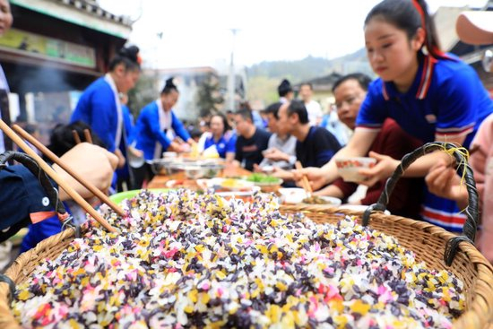 侗族村民制作五色糯米饭招待宾客。杨代富 摄