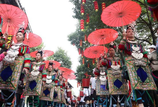 肇兴侗寨侗族群众盛装参加侗年巡游。杨代富 摄
