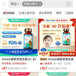 在各大电商平台、短视频直播平台,有不少以“无敏”为宣传的产品。其中一款名为“健敏思无敏婴幼儿维生素AD”的产品,以“无敏AD开创者”“易敏宝宝放心吃”为主要宣传内容,单品在单个平台销售超50万次,有数十个主播、宝妈直播带货,被网友称为该领域内的网红产品。